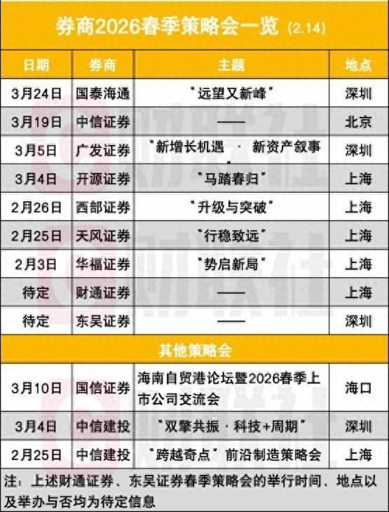 记者获悉,截至2月15日,已有包括国泰海通、中信证券、广发证券、开源证券、西部证券、天风证券、华福证券在内的7家券商,先后确定举办2026年春季策略会。其中,华福证券已率先于2月3日打响春季策略会的“第一枪”。