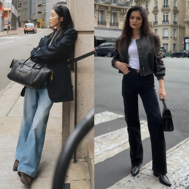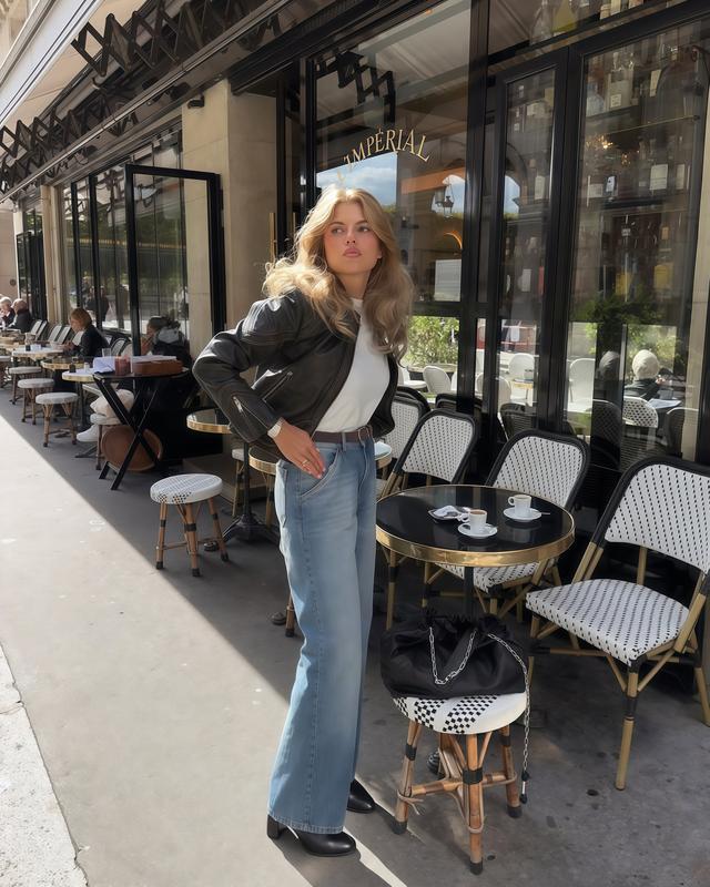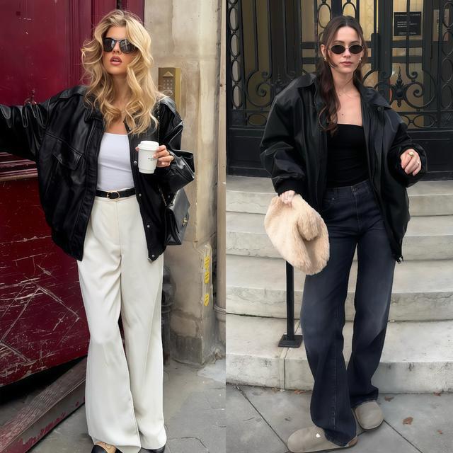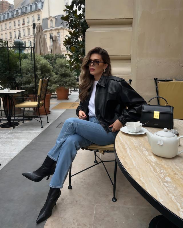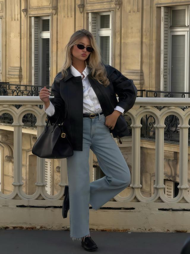 黑色短皮衣是这个组合里最百搭的单品,长度刚好卡在腰线附近,配一条高腰浅蓝阔腿裤,里面塞一件白T,腰线明确、配色干净,周末出门穿这一套,完全不用动脑子。