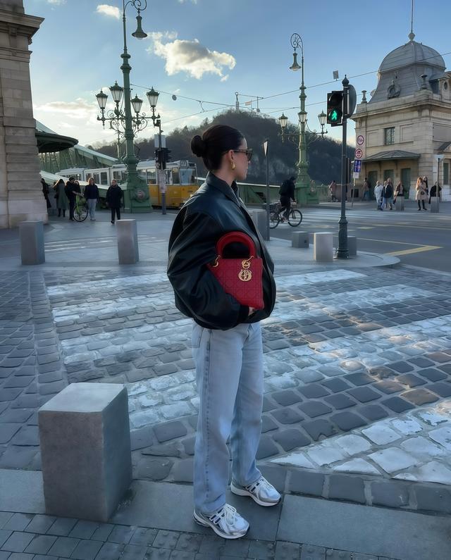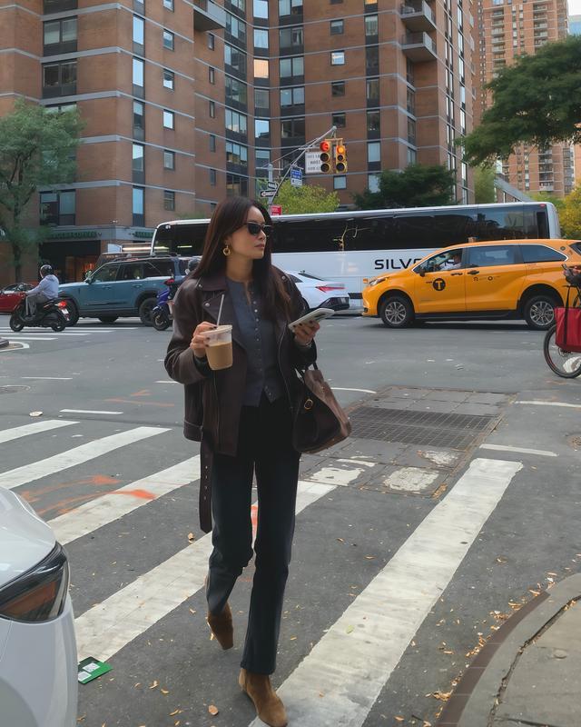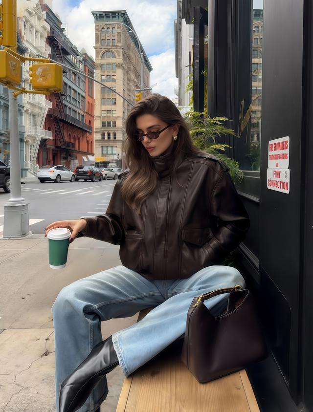 深棕色皮衣穿出来本身就很有年代质感,配上浅蓝色阔腿牛仔裤,暖棕和冷蓝的搭配辨识度很高。再加一副墨镜,复古腔调直接拉满,这套搭配很适合春天出门逛街拍照,随便一站就很出片。