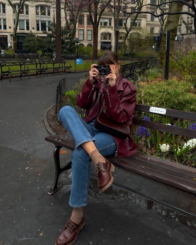 黑色皮衣是经典没错,但穿多了真的会腻。今年很推荐你试试酒红色的皮衣,这个颜色衬肤色,尤其是偏黄的皮肤穿酒红色气色会明显提亮,下面配一条九分直筒牛仔裤露出脚踝,干净洋气,比清一色的黑色多了一份暖意。