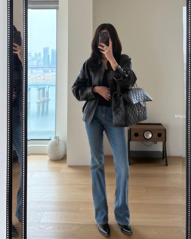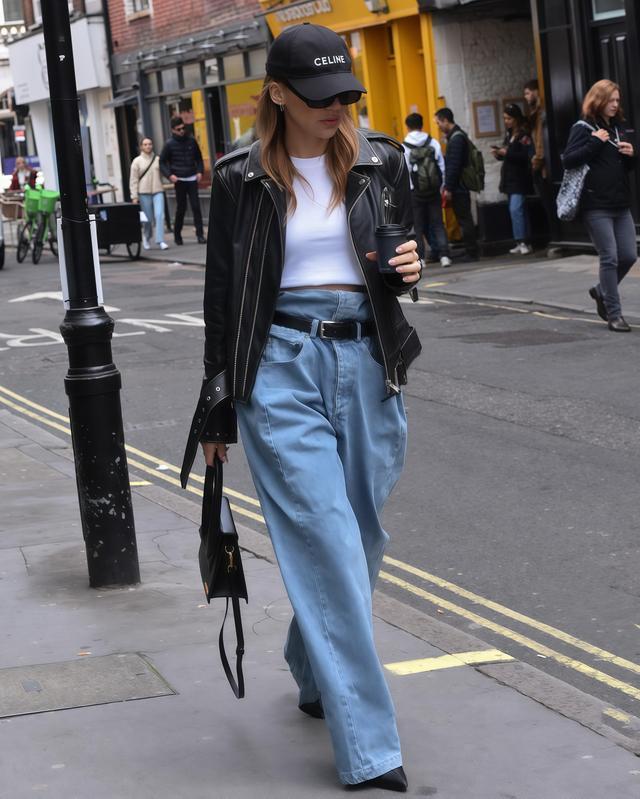 深色皮衣配深色牛仔裤容易出什么问题?两个色块糊在一起,远看就是暗沉沉一片,身材的分界线全没了。但你把裤子换成浅蓝色或者白色,上深下浅的配色,让腰线位置马上就清楚了,浅蓝色牛仔裤本身也提亮下半身,看着干净利落。