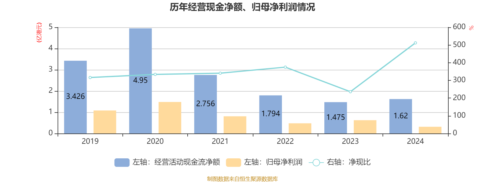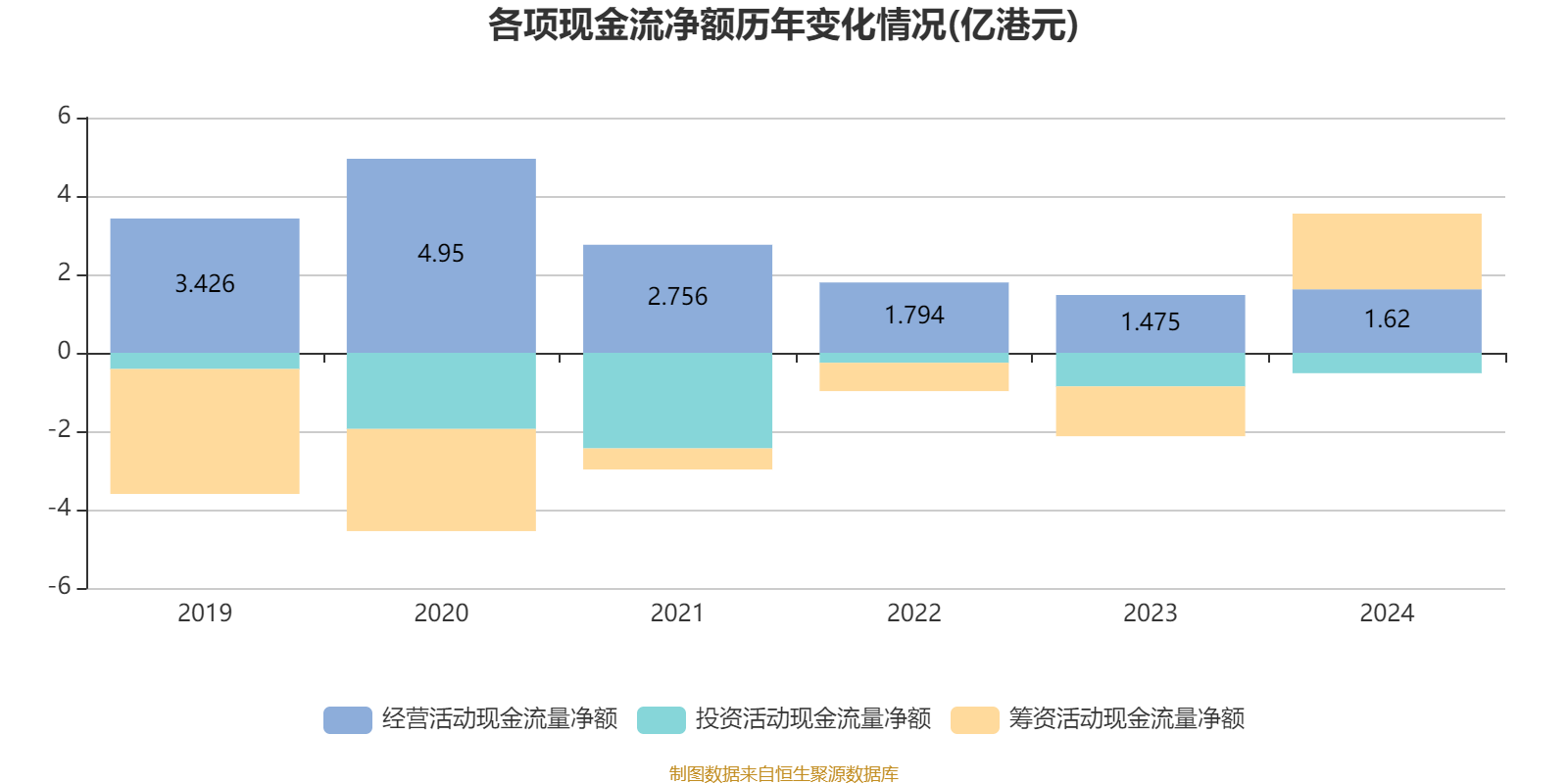 2024年,公司经营活动现金流净额为1.62亿港元,同比增长9.84%;筹资活动现金流净额1.93亿港元,同比增加3.2亿港元;投资活动现金流净额-5201.7万港元,上年同期为-8578.2万港元。